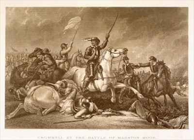 Title: Cromwell leading the charge after being wounded in his right arm at the Battle of Marston Moor